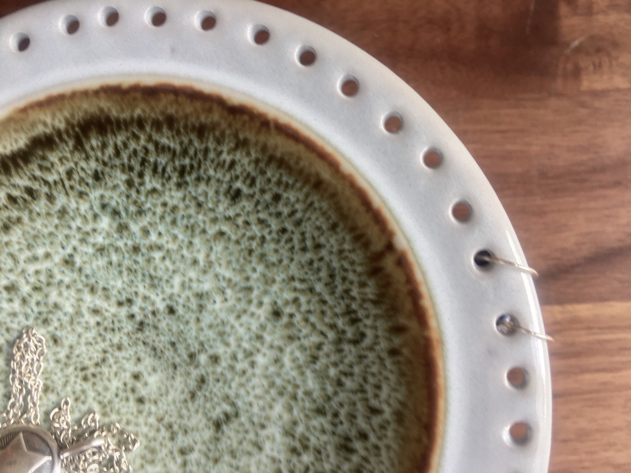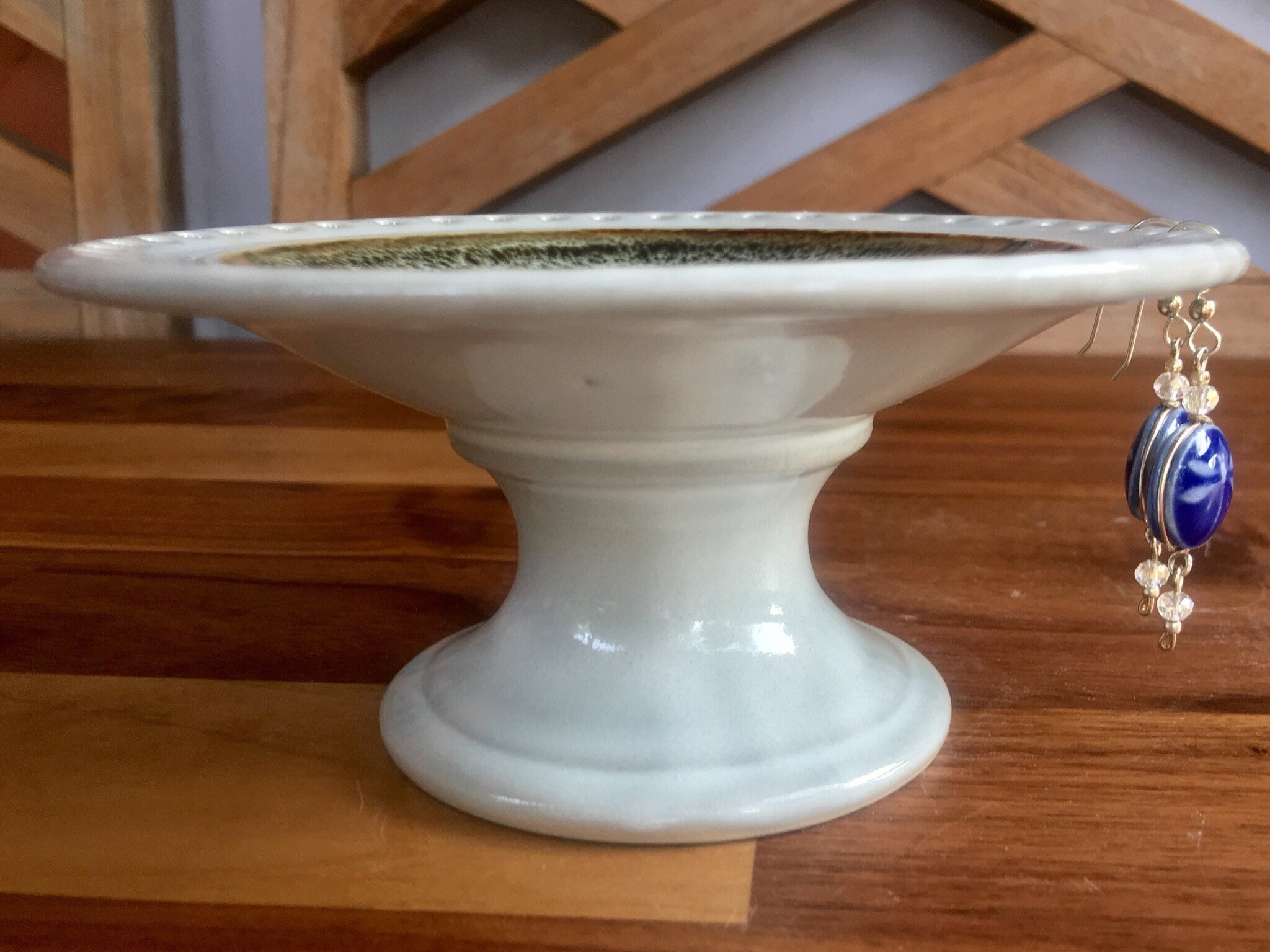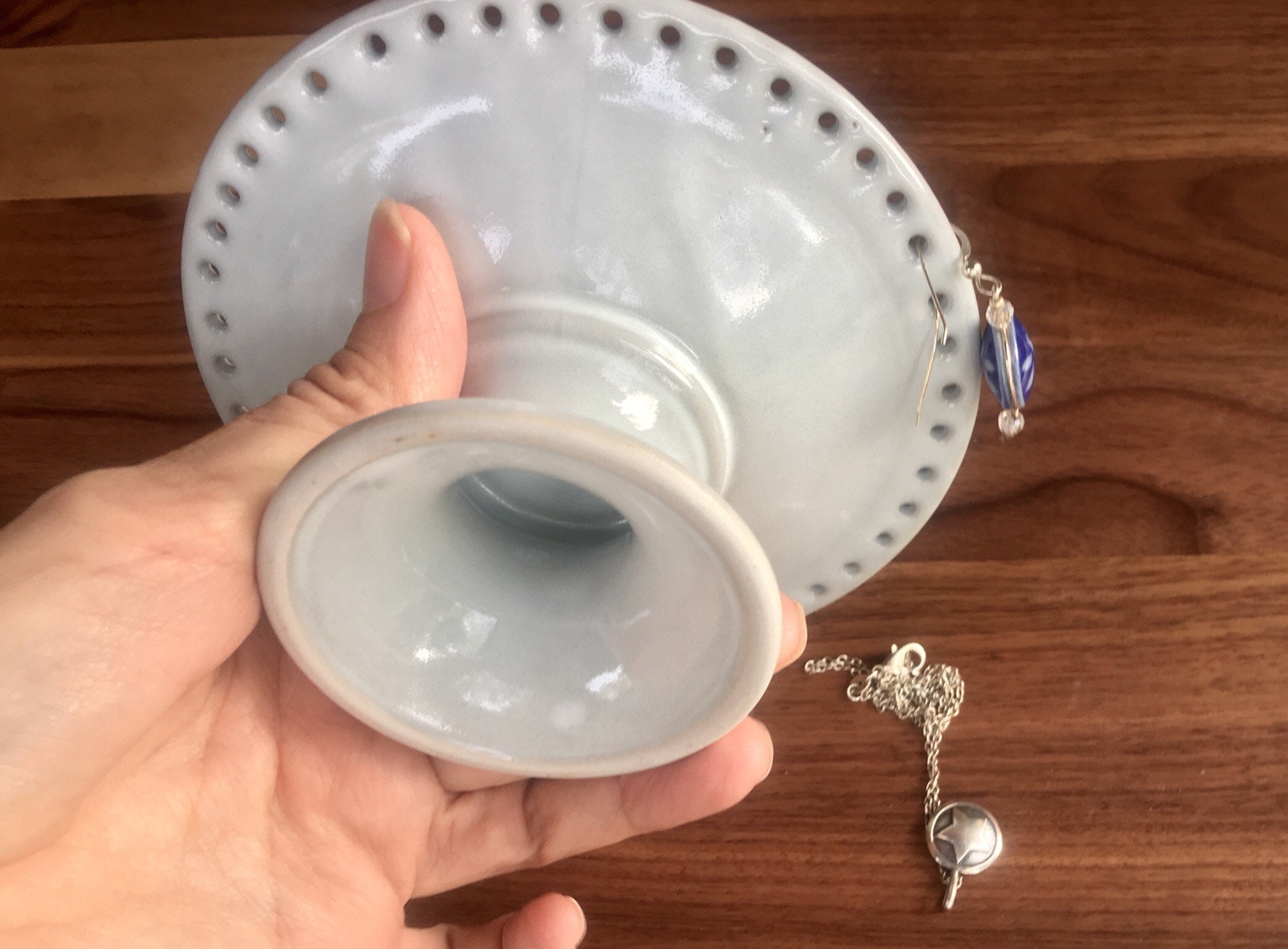 Earring bowl. Handmade pottery Jewelry bowl. Each of these are handmade individually No 2 are exactly alike. 44 Small holes are hand drilled around rim. Large enough to hold a pair of earrings in each. Perfect size on a vanity or dresser to keep your favorite jewelry pieces handy for the next day. This piece is a one of a kind The piece that is pictured is the piece you will get. Thank you for shopping with Porcelain Fire.
