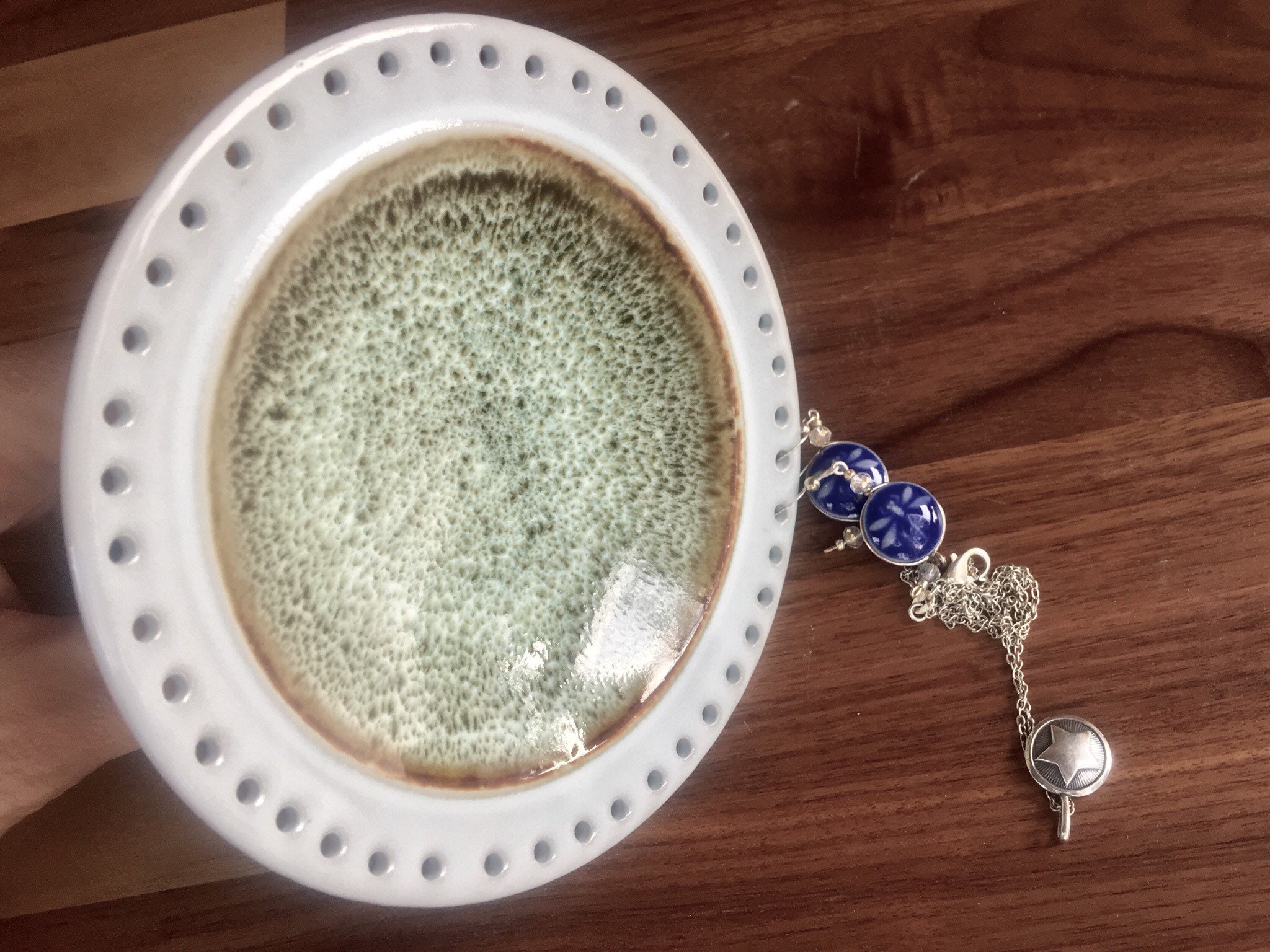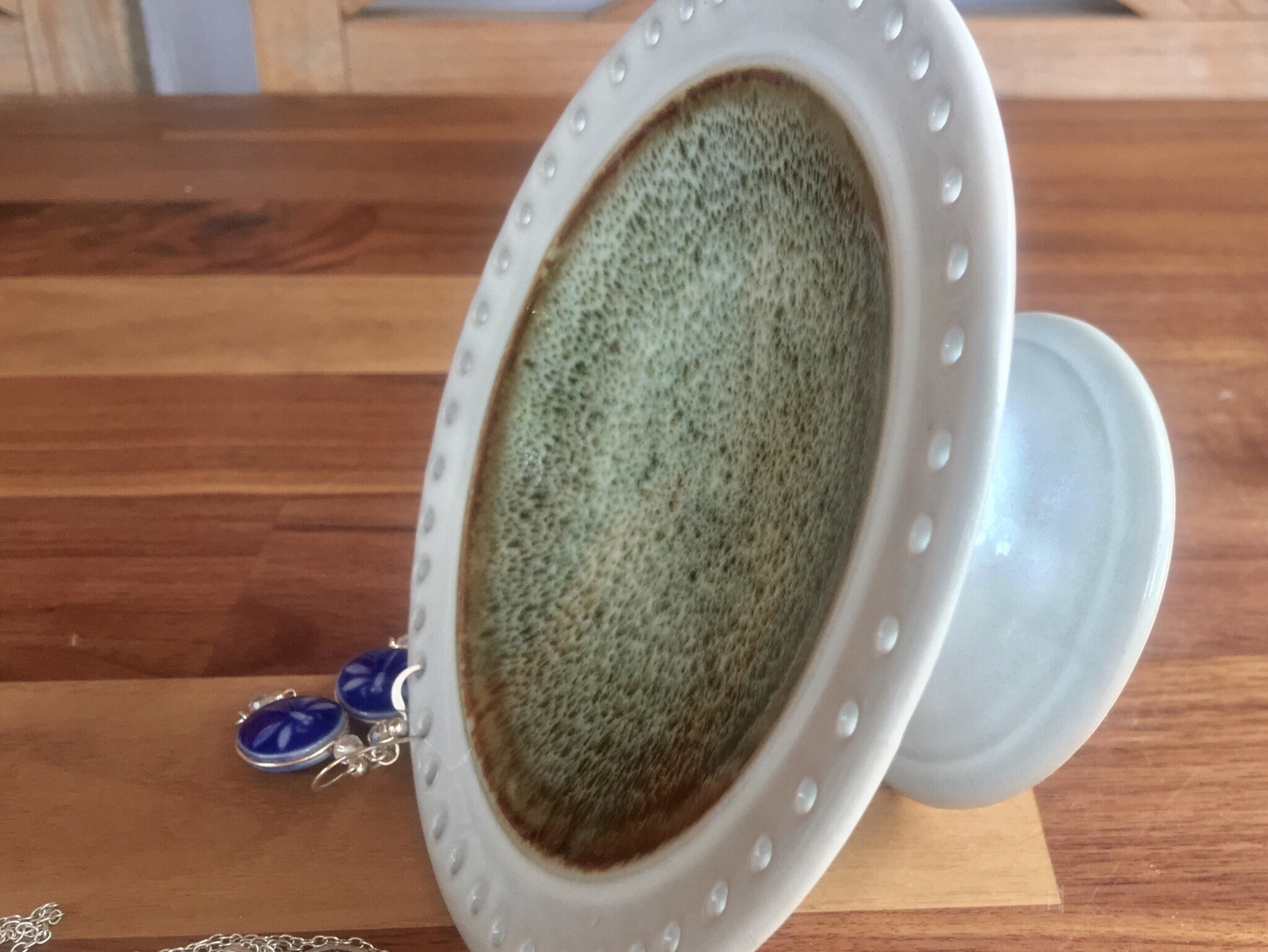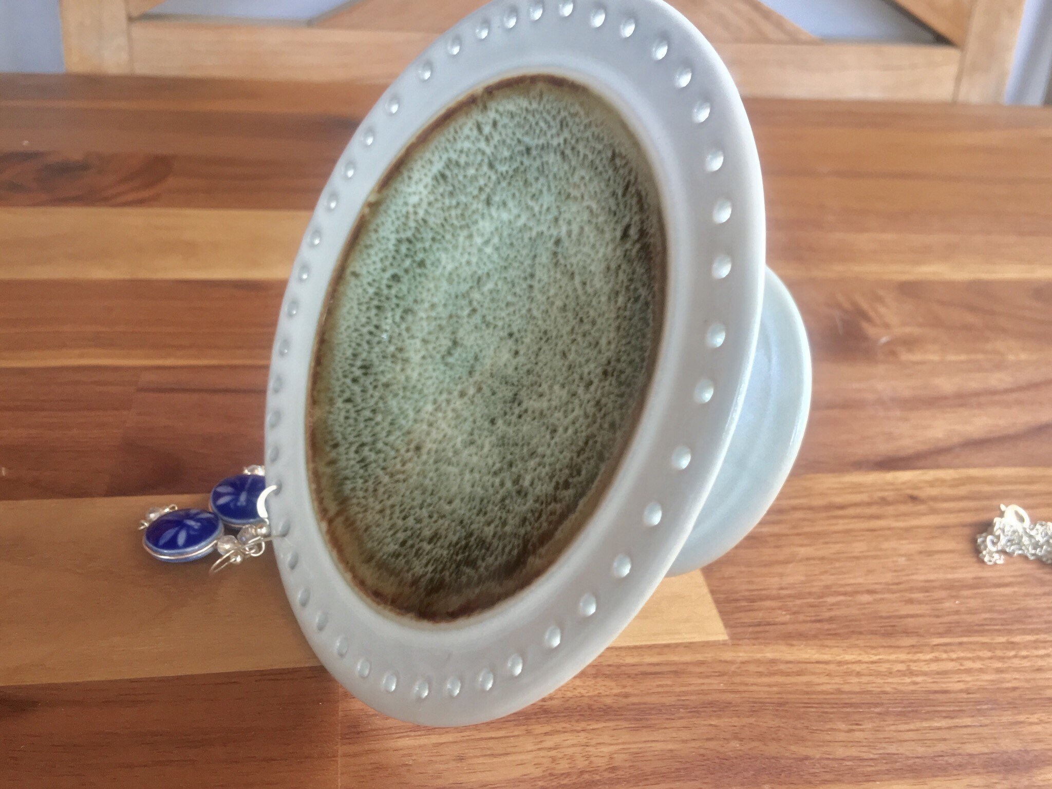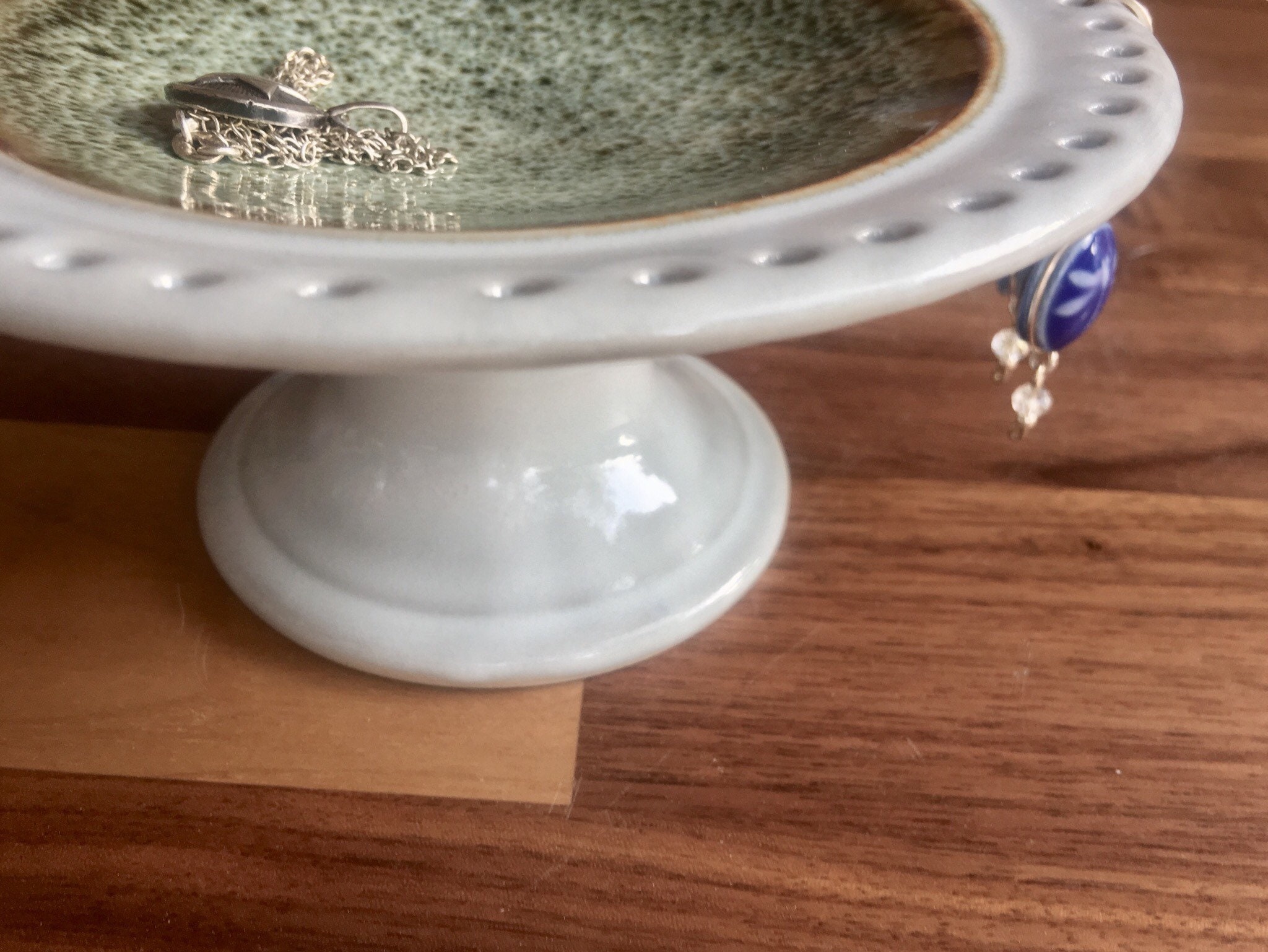 Earring bowl. Handmade pottery Jewelry bowl. Each of these are handmade individually No 2 are exactly alike. 44 Small holes are hand drilled around rim. Large enough to hold a pair of earrings in each. Perfect size on a vanity or dresser to keep your favorite jewelry pieces handy for the next day. This piece is a one of a kind The piece that is pictured is the piece you will get. Thank you for shopping with Porcelain Fire.