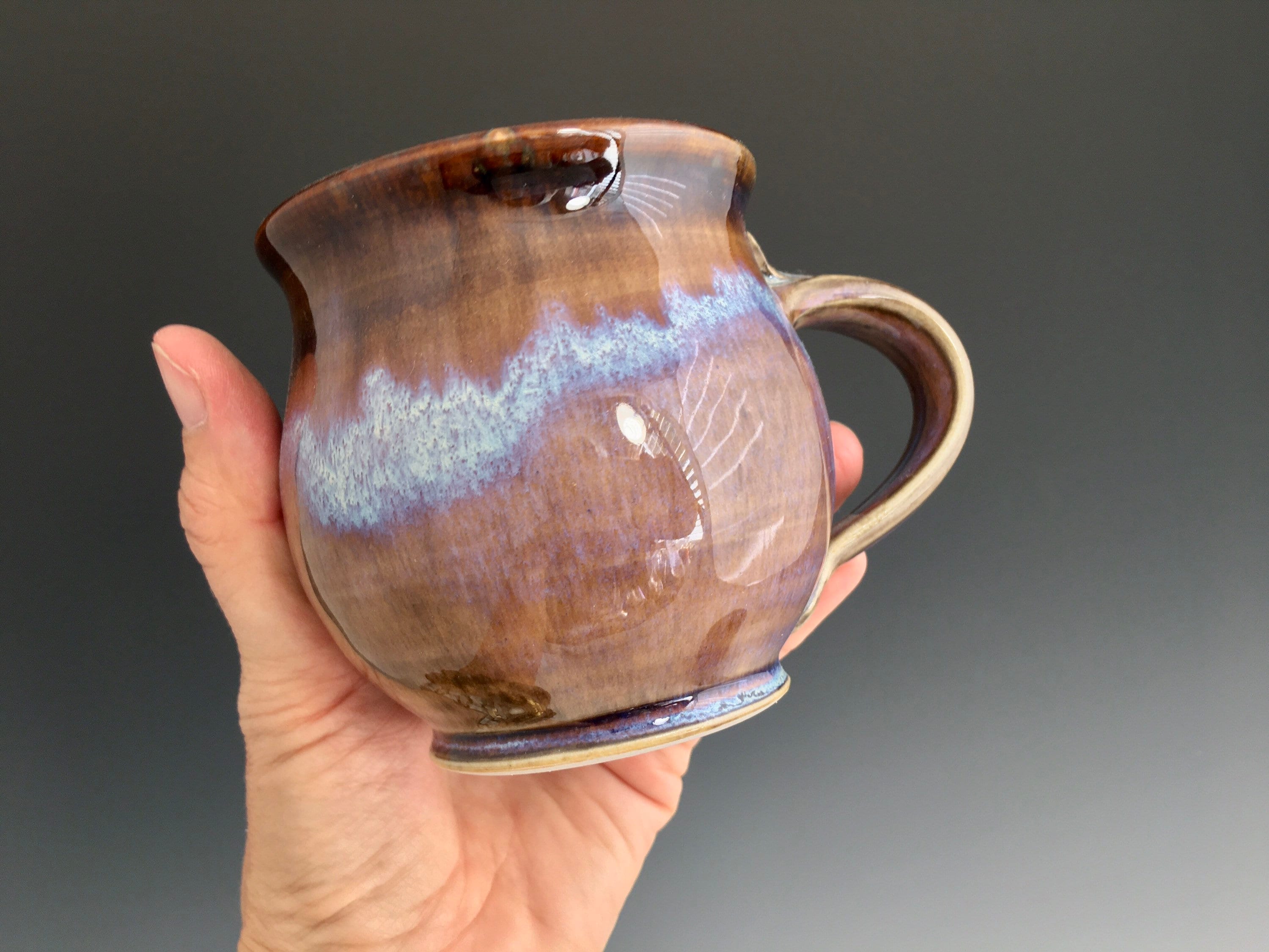 Uniquely glazed mug great for hot or cold drinks. The glaze colors are perfect for Autum, Fall season. Enjoy serving and drinking coffee or tea or maybe hot cider in these one of a kind mugs. Sweet size holds about 10 ounces. We fire our pottery high up-to cone 12 making a strong durable ceramic product. Glazes melt and move together during the 8-12 hour firing process making every kiln load a unique surprise