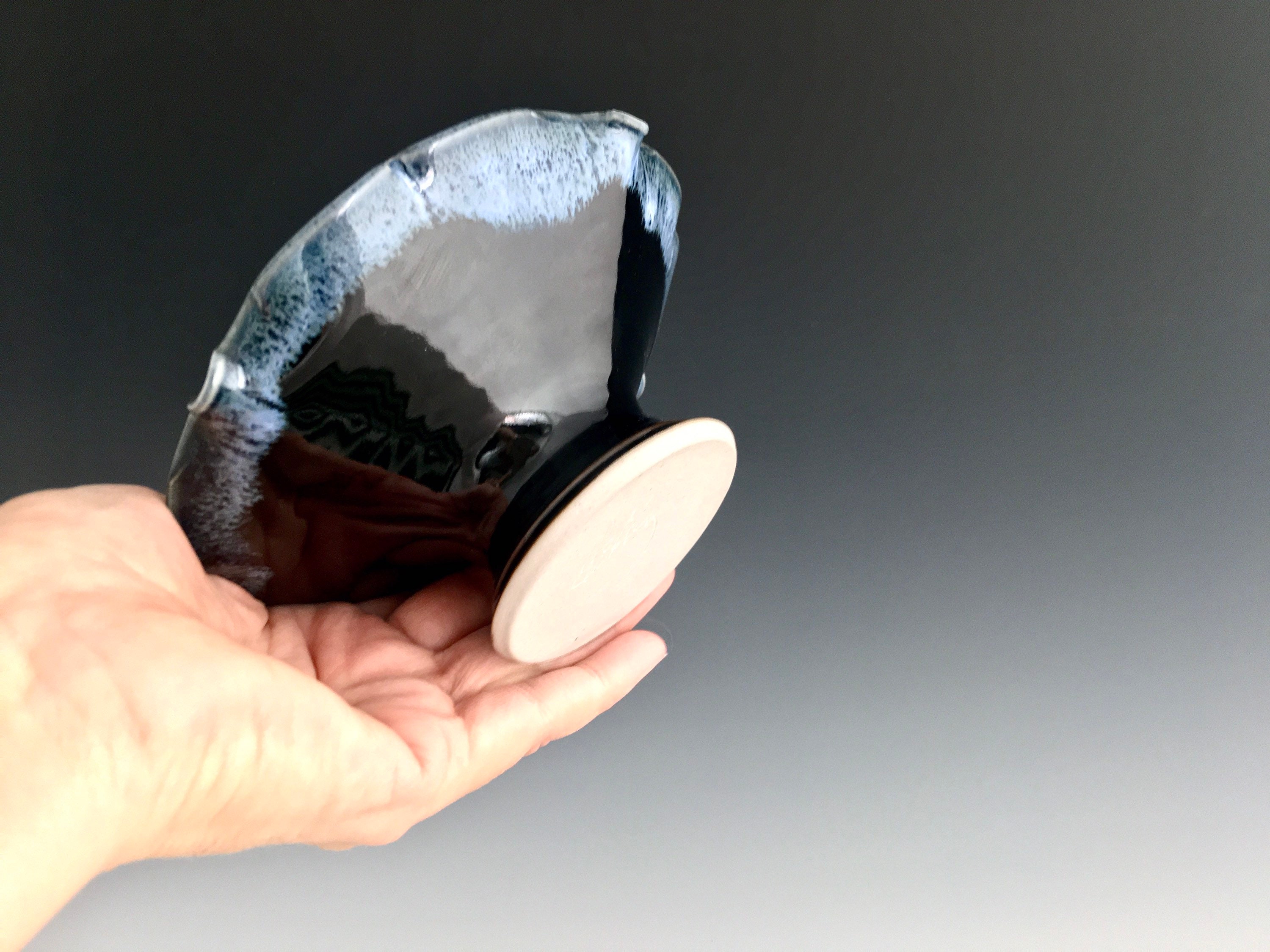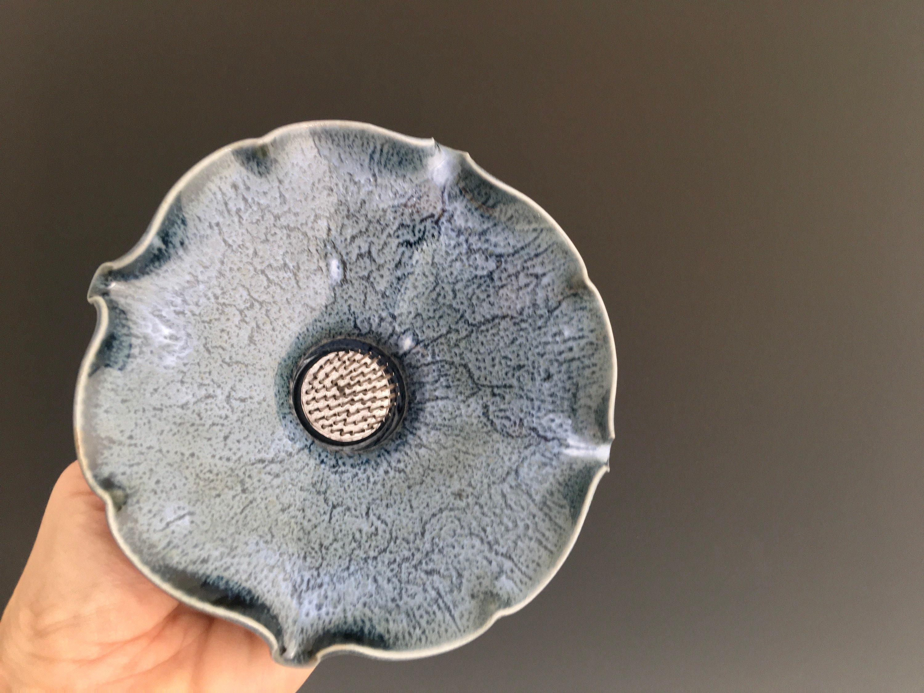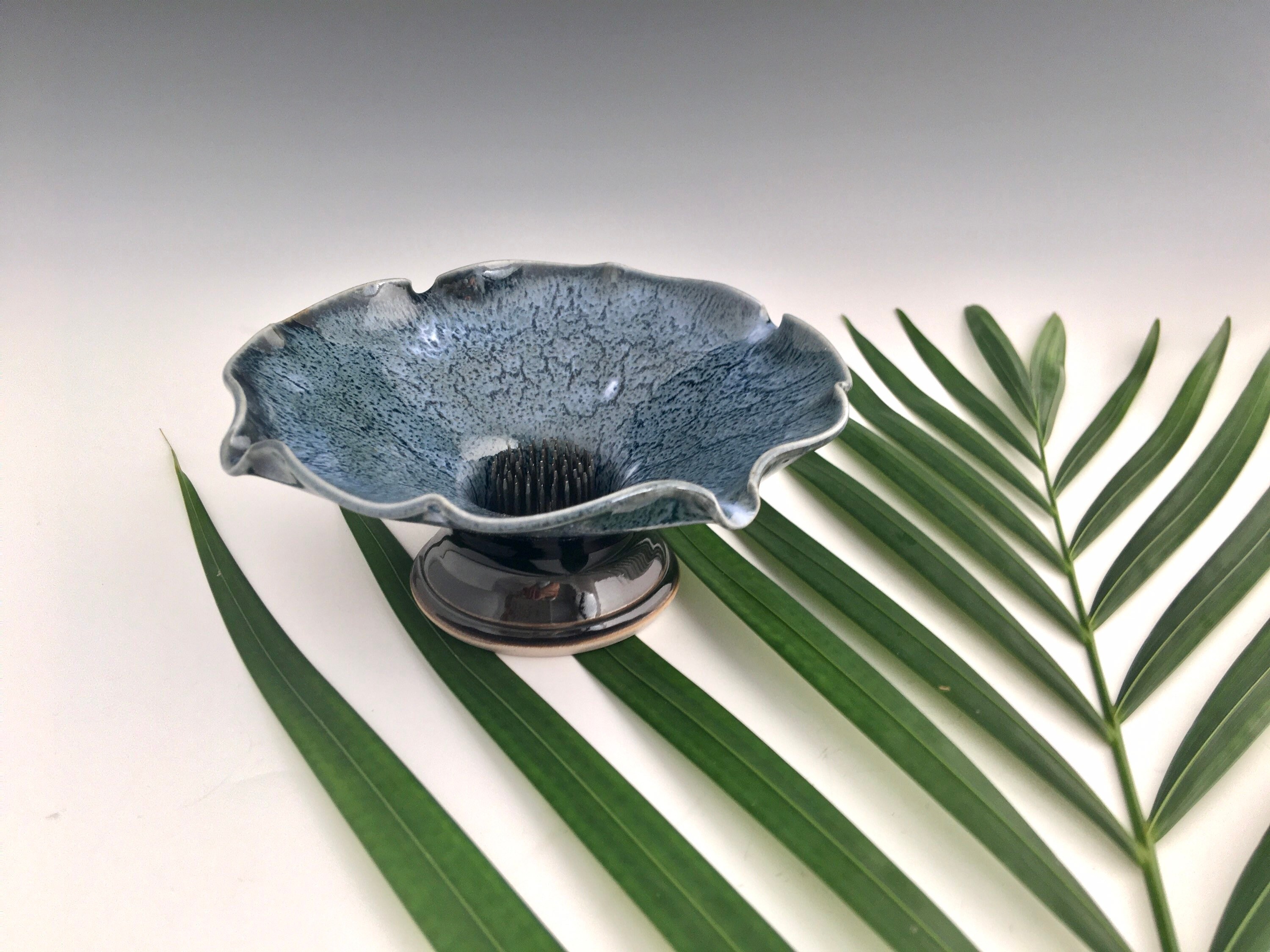 Ikebana with Pin Frog, Japanese Style Flower Arranging Vase, centerpiece, Handmade Porcelain Pottery Open Flower Bowl Blue Black glazed Pottery vase with Floral frog, also called Kenzan