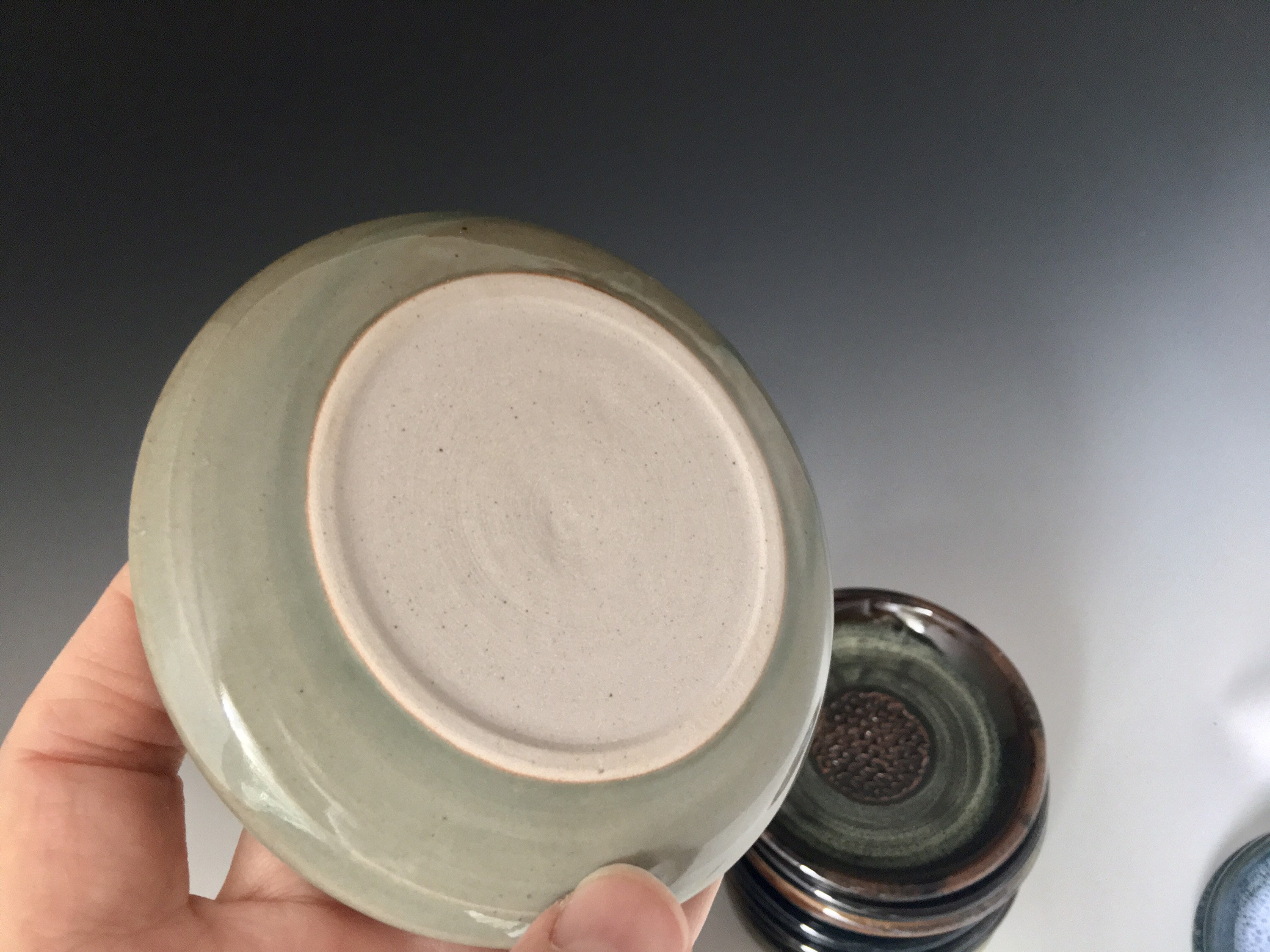 Nice size fits in your hand. Hand made porcelain and stoneware pottery and high fired in our own formulated glazes.
